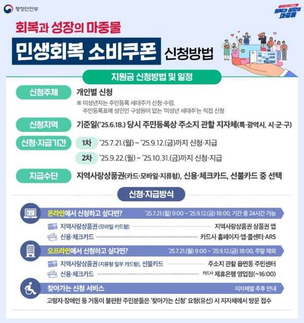 정부가 2025년 7월 21일부터 전 국민 대상 민생회복 소비쿠폰을 지급합니다.